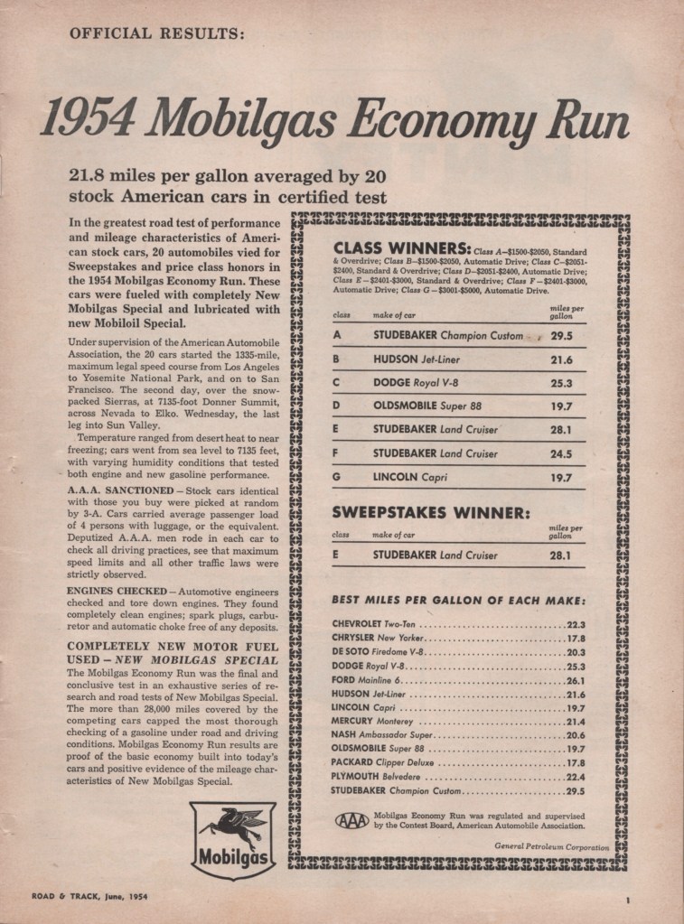 A MOBILGAS AD back in 1954 read, “In the greatest road test of performance and mileage characteristics of American stock cars, 20 automobiles vied for Sweepstakes and price class honors in the 1954 Mobilgas Economy Run.”
