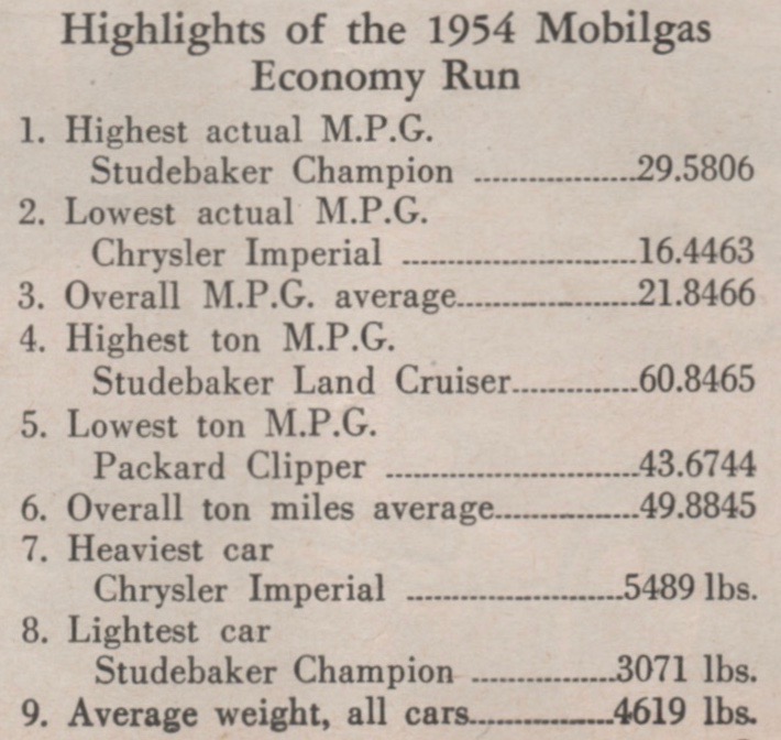 The 1954 Mobilgas Economy average of 21.8 mpg would invoke a Federal Gas Guzzler Tax of $1000 per car. This is the lowest assessed tax in a graduated scale that ranges from tax-free cars achieving at least 22.5 mpg to a whopping $7700 for those achieving less than 12.5 mpg.