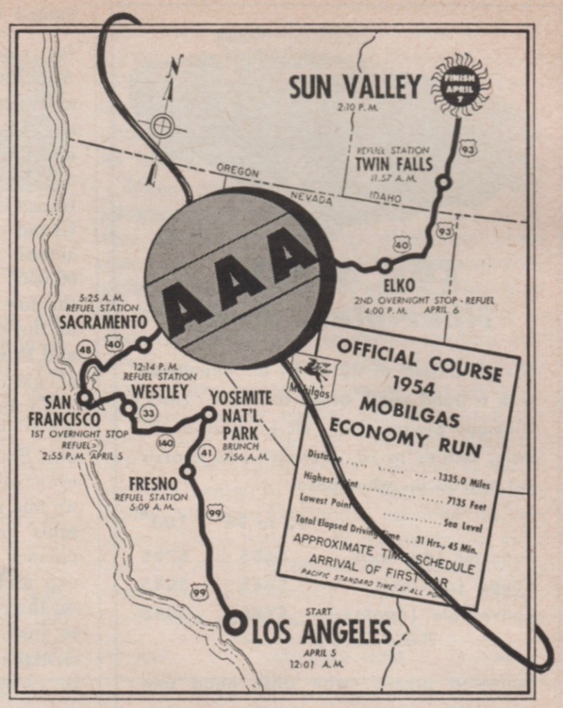 The 1954 run traveled from Los Angeles to Fresno, then a visit to Yosemite National Park, followed by a westward amble to San Francisco, then northeast through Sacramento, across Donner Summit to Elko, Nevada, concluding with a northerly drive to Twin Falls, Idaho, and ending in that state’s Sun Valley, a total distance of 1335 miles.