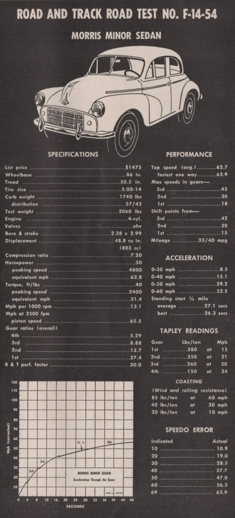 By 1954, R&T had been published monthly for five years after an on-again/off-again start in 1947. In October 1954, it tested the Morris Minor Sedan. Here are tidbits gleaned from this road test, together with my usual Internet sleuthing and colleagues’ personal interactions.