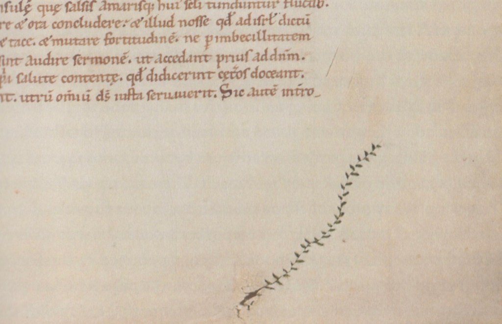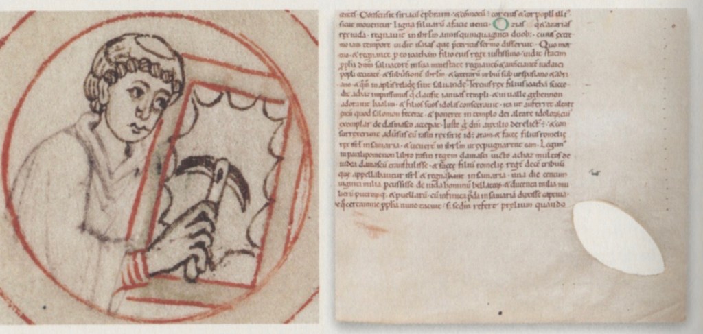 Opps. A lunellum, a curved blade with a handle, was the tool used for this “rasping.” However, with the material under tension, an accidental nick could easily open up into an oval gap in the skin. “We can see examples of this in Bodley 717 on folios 36 and 53 and elsewhere.”