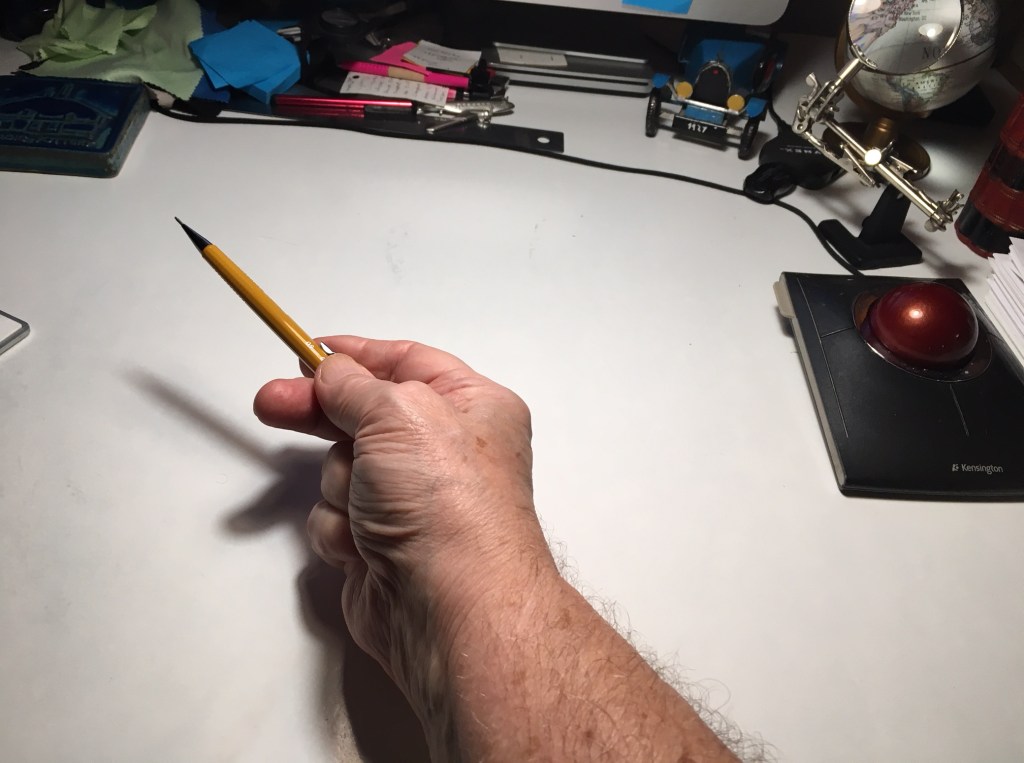 By contrast, he notes, “In the images here and in almost all others showing scribes in medieval manuscripts, the pen is held by the thumb against the underside of the first two fingers, more like a painter’s brush inverted. The two smaller fingers are tightly curled up. To write, the whole hand has to move across the page, and the entire arm is involved.”