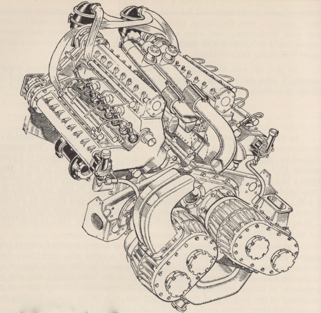 “Drawn from a downdraught double-choke four-float Solex carburetter,” Pomeroy wrote, “the mixture was supplied at 30 lb. boost (3 ata.) and, with this boost pressure, well over 300 b.h.p. might well have been expected from the engine in its fully developed form.”