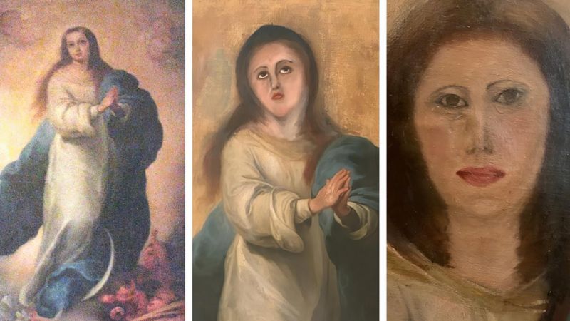 The art work is a copy of a painting by Spanish Baroque artist Bartolomé Estaban Murillo, 1618–1682. Its owner in Valencia gave a furniture restorer two chances to repair the Virgin Mary’s visage.