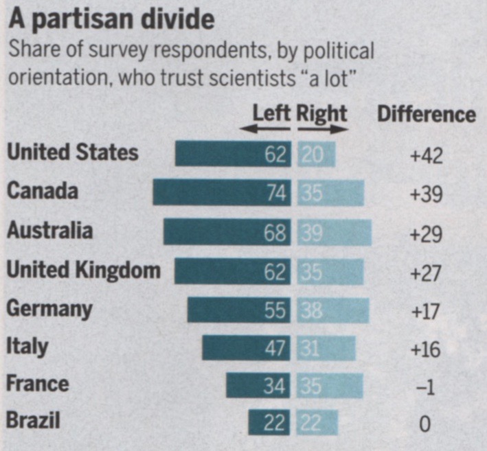 A Partisan Divide. Science writes, “When it comes to trusting scientists, Americans are the most split ideologically, a survey of 20 countries found. Some 62 percent of Americans who identified their politics as left wing said they held ‘a lot’ of trust in science ‘to do what is right’ for the public, the Pew Research Center reported on 29 September. But only 20 percent of those who identified with the right wing expressed that level of confidence.”