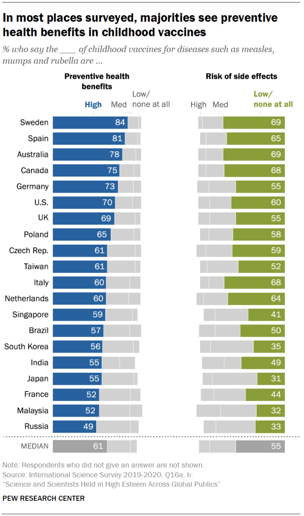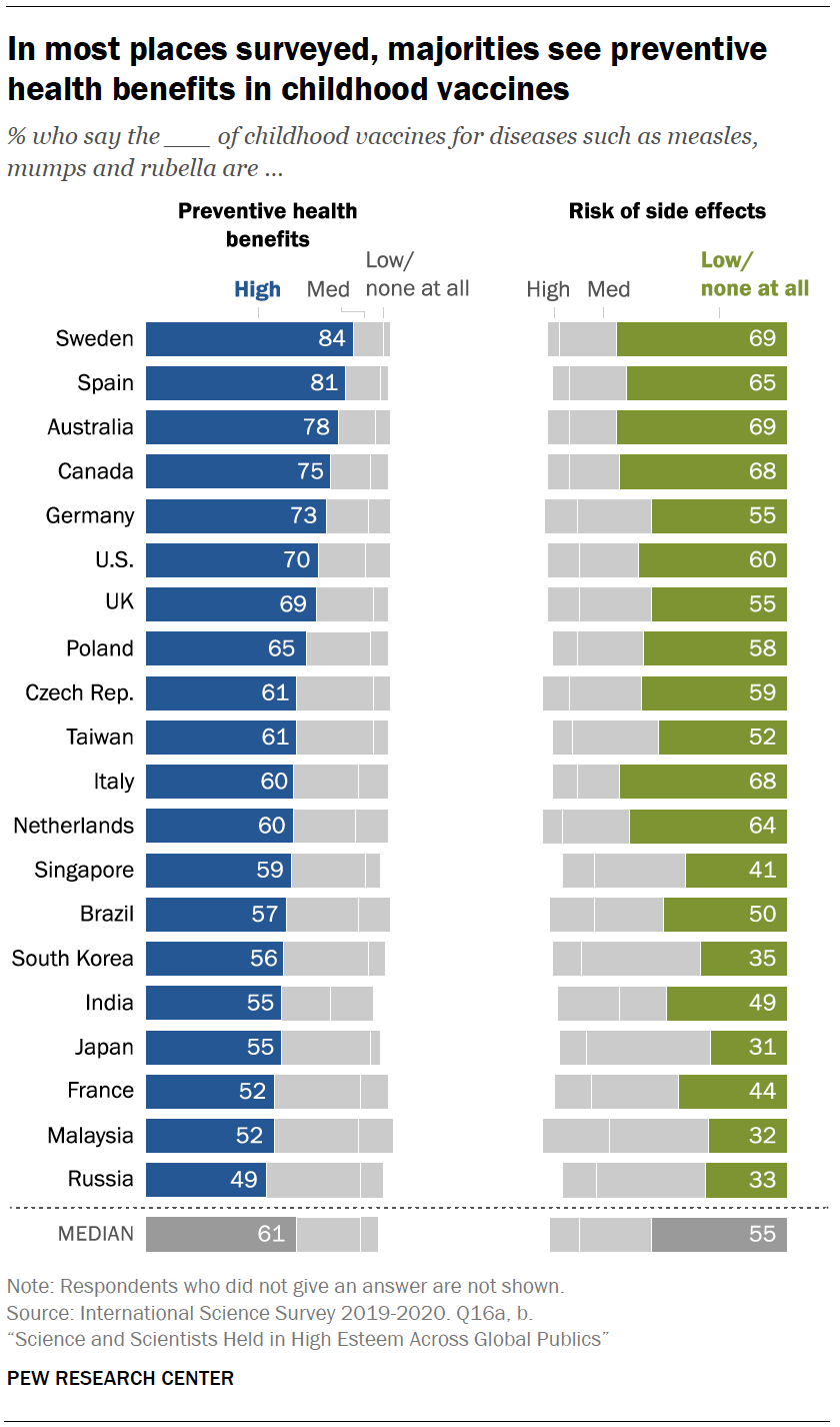 Childhood vaccinations. For example, Pew Researchers report, “While many see childhood vaccines as bringing high preventative health benefits, in some places sizable shares are not fully convinced.”