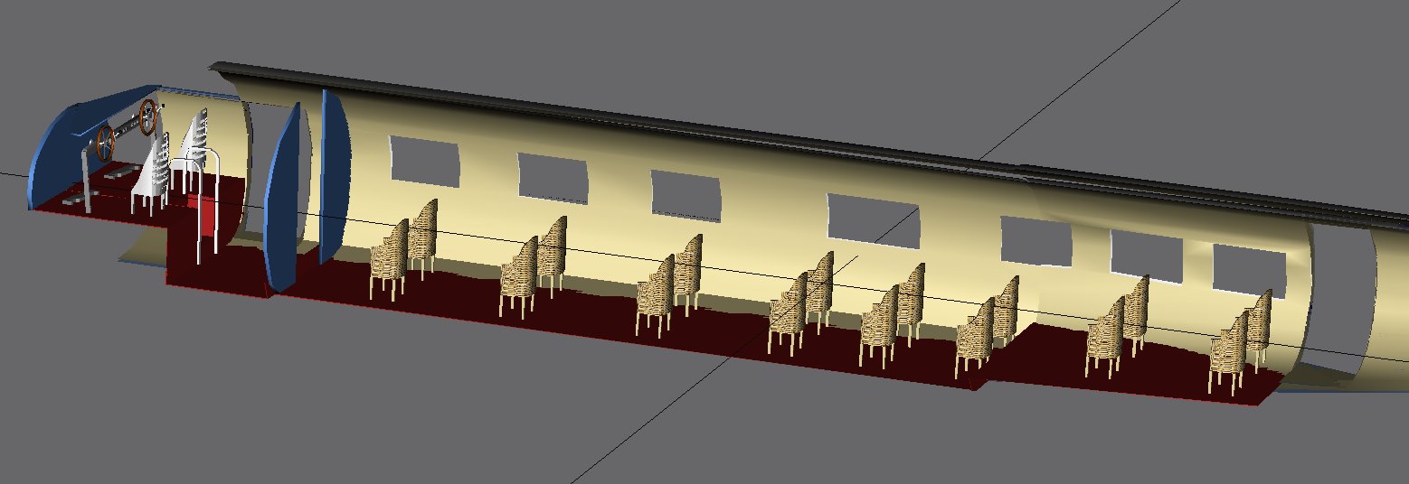 GMax Considerations. The F.180’s wings were straightforward contoured GMax Boxes; its oval fuselage began as a GMax Cylinder with Boolean operations cutting out its windows, doors, and ports. Then a cloned version, slightly downsized with inverted normals, served as the fuselage interior walls.