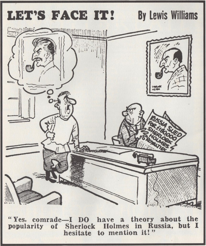 THE DAILY TELEGRAPH of London, August 18, 1959, had the definitive word on Sherlock Holmes, his chronicler Dr. John H. Watson, Watson’s literary agent Sir Arthur Conan Doyle, and the Kremlin: The newspaper reported, “Sherlock Holmes suffered one of his rare defeats here to-day… in the fight for authors’ compensation from Soviet publishers.” This, as shared in The Sherlock Holmes Scrapbook, as edited by Peter Haining, with a foreward by Peter Cushing, Clarkson N. Potter, 1974.