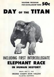 Wife Dottie’s Elephant Tale. On May 11, 1962, Orange County State College held what may well have been the world’s first intercollegiate elephant race—and Wife Dottie was part of its organization and publicity. She was a student assistant to Raynolds Johnson, public relations director at the fledgling institution. Ray was emeritus professor of communications when he passed away in 2004