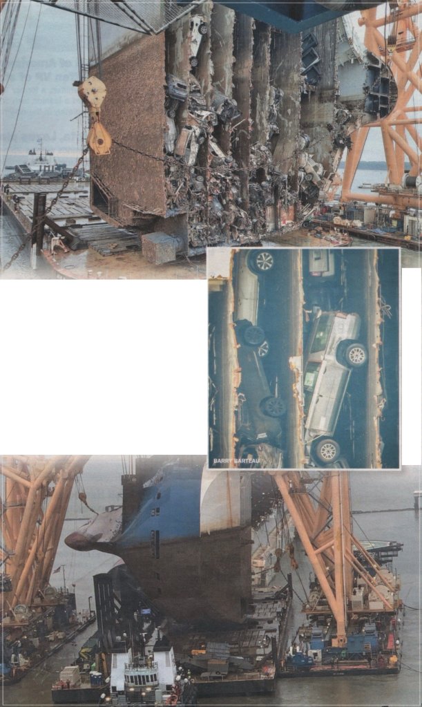 “The operation,” Automotive News said, “is using the largest barge in the U.S. to haul away the ship in eight pieces, with a 1-mile perimeter of mesh netting set up to catch vehicles and other debris that fall out.”