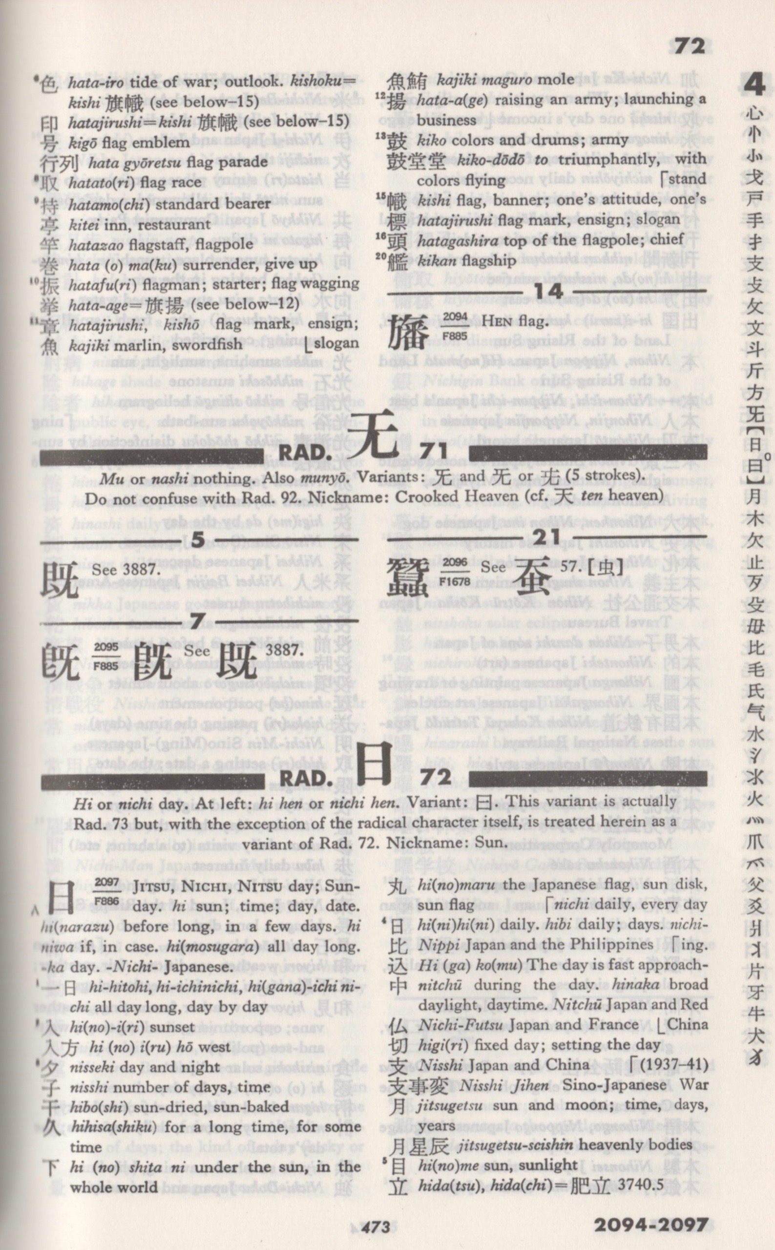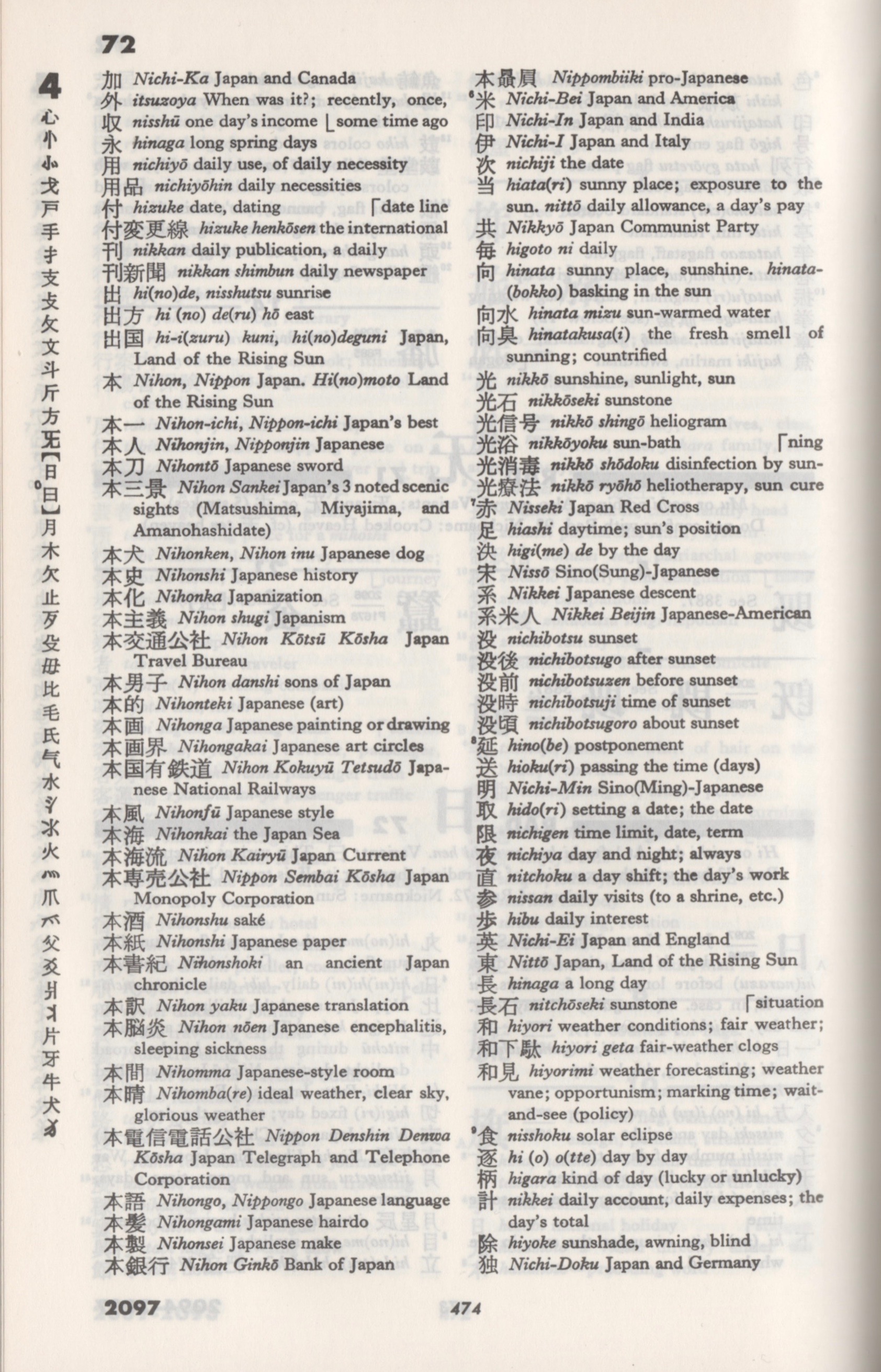Looking up a Japanese word is a non-trivial operation. Consider 日本. The radical 日 has four strokes (its left vertical downstroke, an inverted L to the right, and two cross strokes). This is character No. 72 in my dictionary’s chart of radicals. Pronounced jistu, nichi, or nitsu, its meaning is “sun,” “Sunday.’