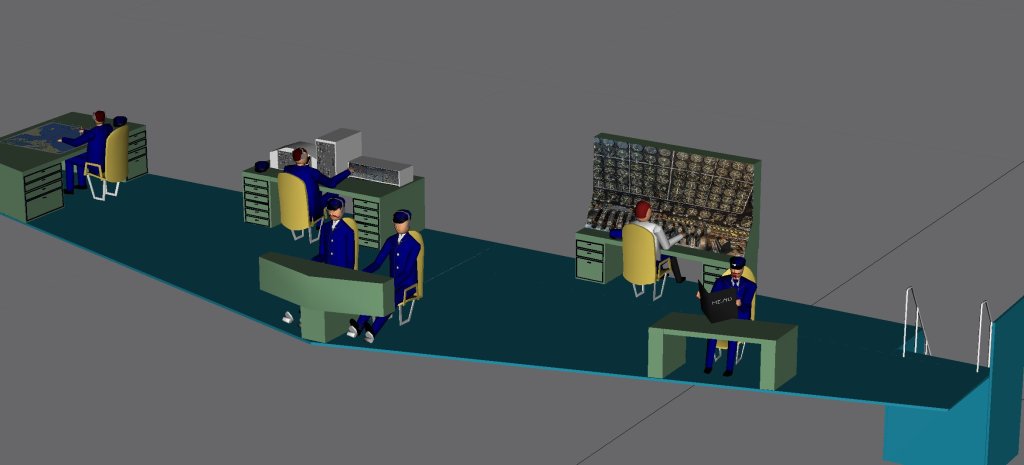 It wasn’t until rendering of the Bel Geddes flight deck that my GMax modeling got interesting, if not completely out of hand. I had no documentation of the flight deck, only an accounting of its crew and their responsibilities. I opted for showing the Captain, Pilot, Copilot, Chief Engineer, and one each of the Navigators and Radio Operators. Again, cloning gave me easy fabrication of each, though I had fun mixing and matching crew members (and faces) of earlier craft. As a final fillip, I figured my Captain had nothing better to do that peruse a Menu.