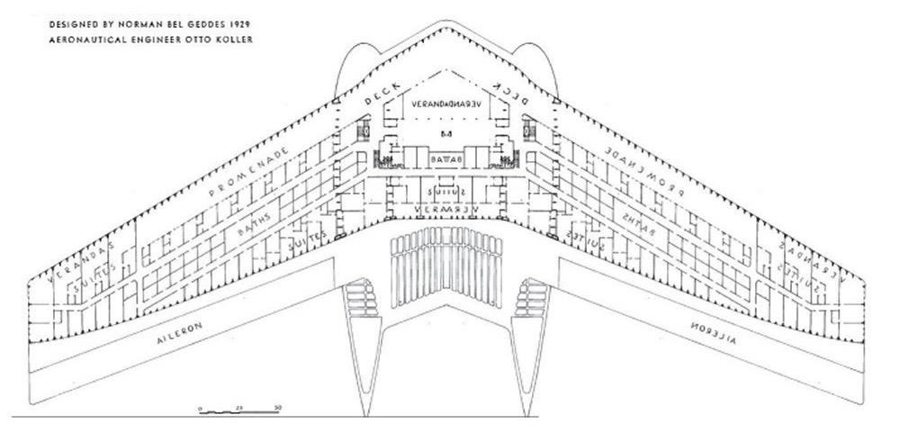 A Vast Design. Norman Bel Geddes wasn’t aeronautically trained, but he collaborated with Otto A. Koller, a German aeronautical engineer. Indeed, they disagreed about details of an earlier design study; according to Wikipedia, Koller described Airliner Number 1 as “an absolute[ly] undesirable design.” Nor did Koller provide performance specifications for Airliner Number 4, which received extensive coverage in Bel Geddes’ book Horizons, 1931. Wikipedia notes, “Geddes devoted over ten pages of the book to the project, including a fulsome endorsement of Koller’s skills as an aircraft engineer….”