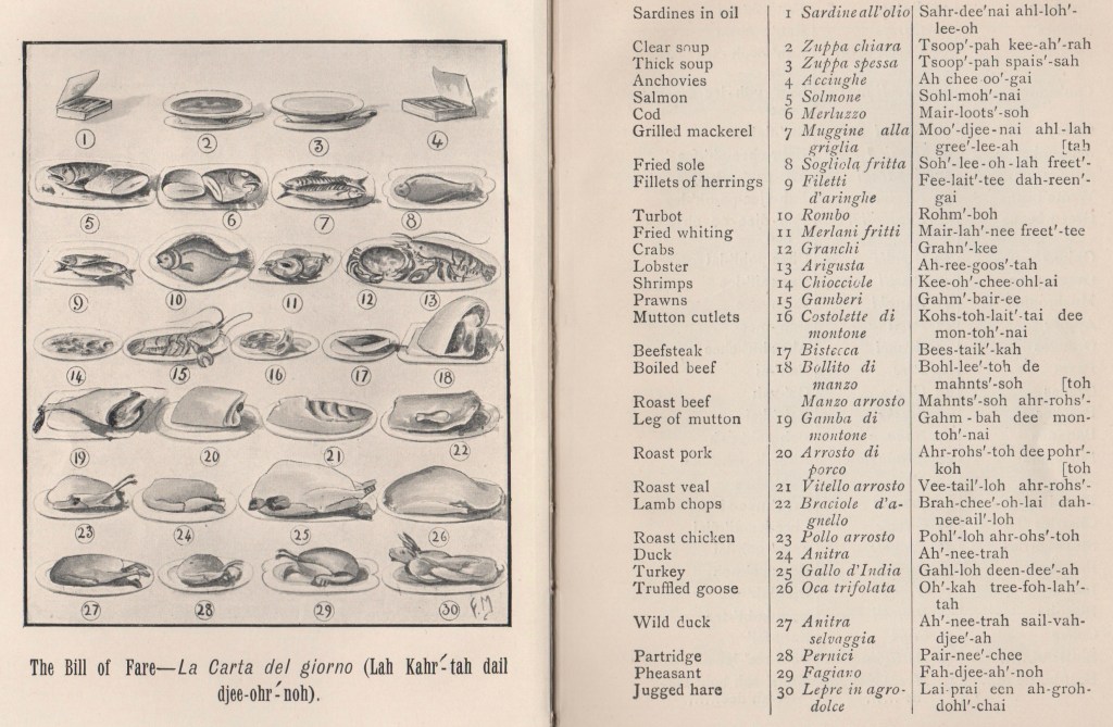 ON THE LONG shot that you might be dining (likely these days outdoors) at an Italian restaurant, here are culinary translational tidbits gleaned from a little guidebook. It’s more than 100 years old, but I suspect the lingo hasn’t changed.