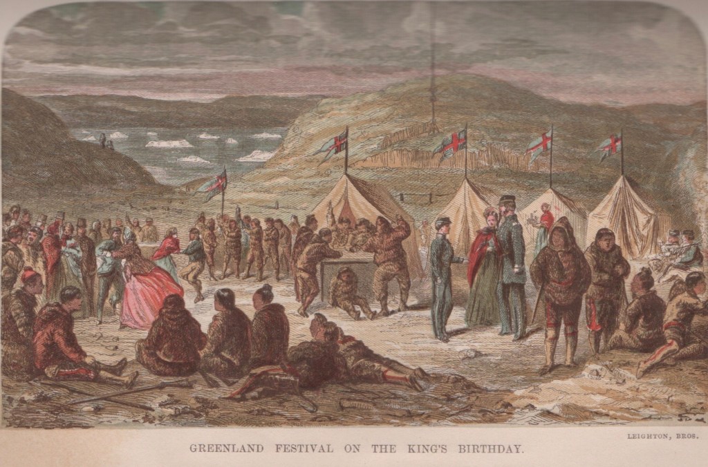 On the king’s birthday, Hall described, “His Danish majesty supplied the good cheer, and Europeans as well as Esquimaux alike join in the festivity.”