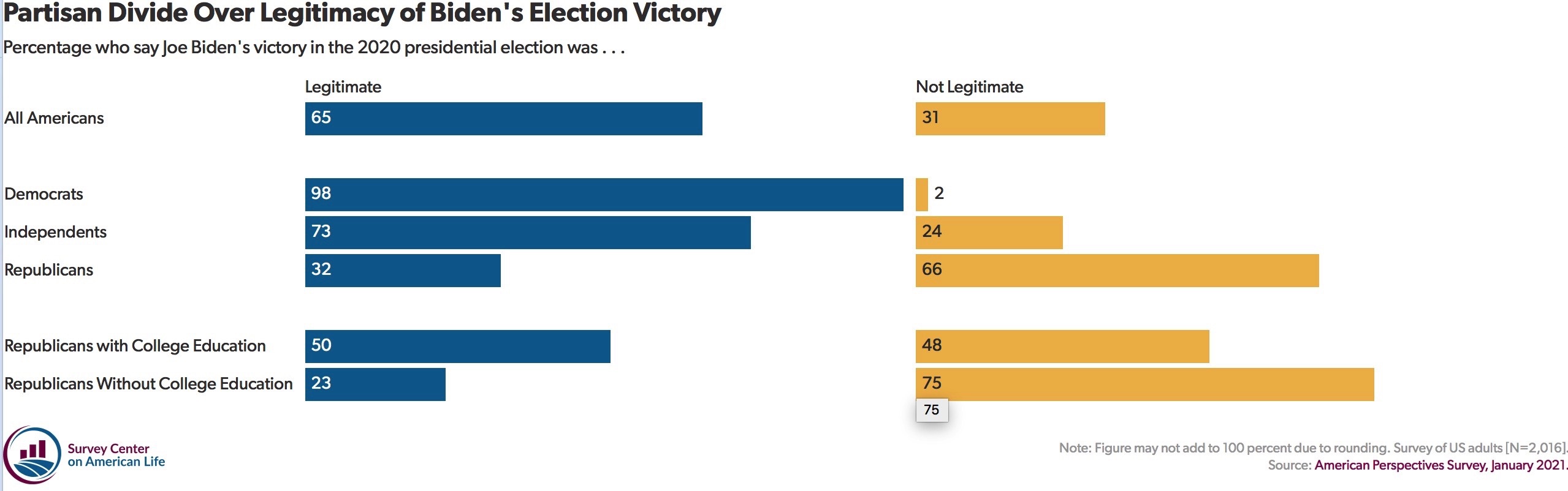 AEI continues, “There are stark divisions by education level among Republicans. Three-quarters of Republicans who do not have a four-year college degree challenge the legitimacy of Biden’s election, while college-educated Republicans are divided, with roughly as many accepting the legitimacy of Biden’s win as denying it (50 percent vs. 48 percent).”
