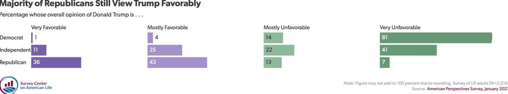 What of Trump’s Standing? The AEI survey holds that “Although some Republican leaders criticized Trump for his role in the assault on the U.S. Capitol, he remains personally popular among rank-and-file Republicans. Nearly eight in 10 (79 percent) Republicans have a favorable opinion of Trump, while one in five (20 percent) view the former GOP president negatively. In contrast, a majority of Democrats (95 percent) and independents (63 percent) have a negative view of Trump.”