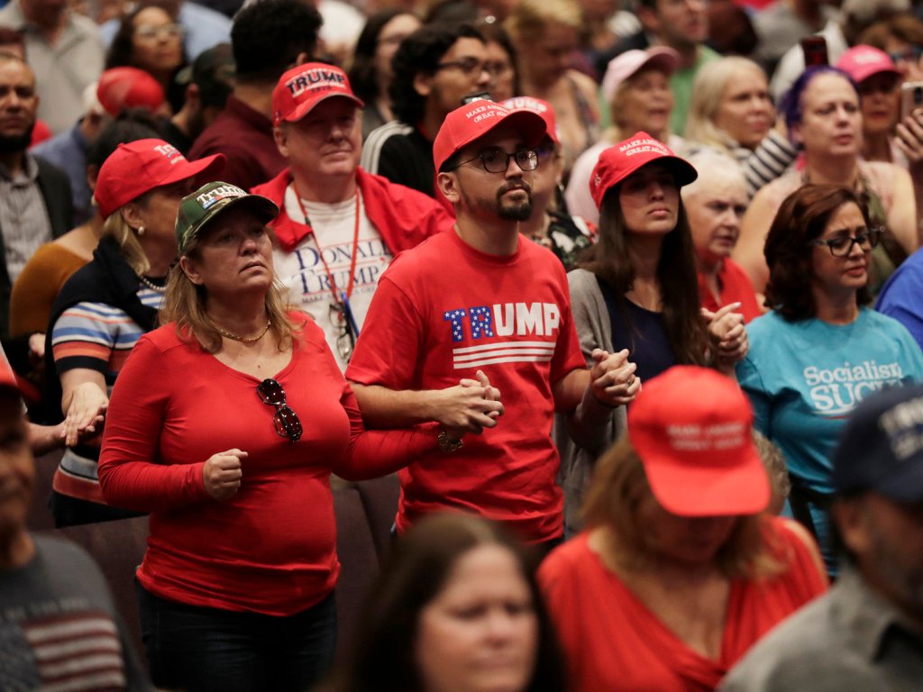 Supporters of President Donald Trump pray during a rally at the King Jesus International Ministry church in Miami, Jan. 3, 2021. Image by Lynne Sladky/AP from NPR.