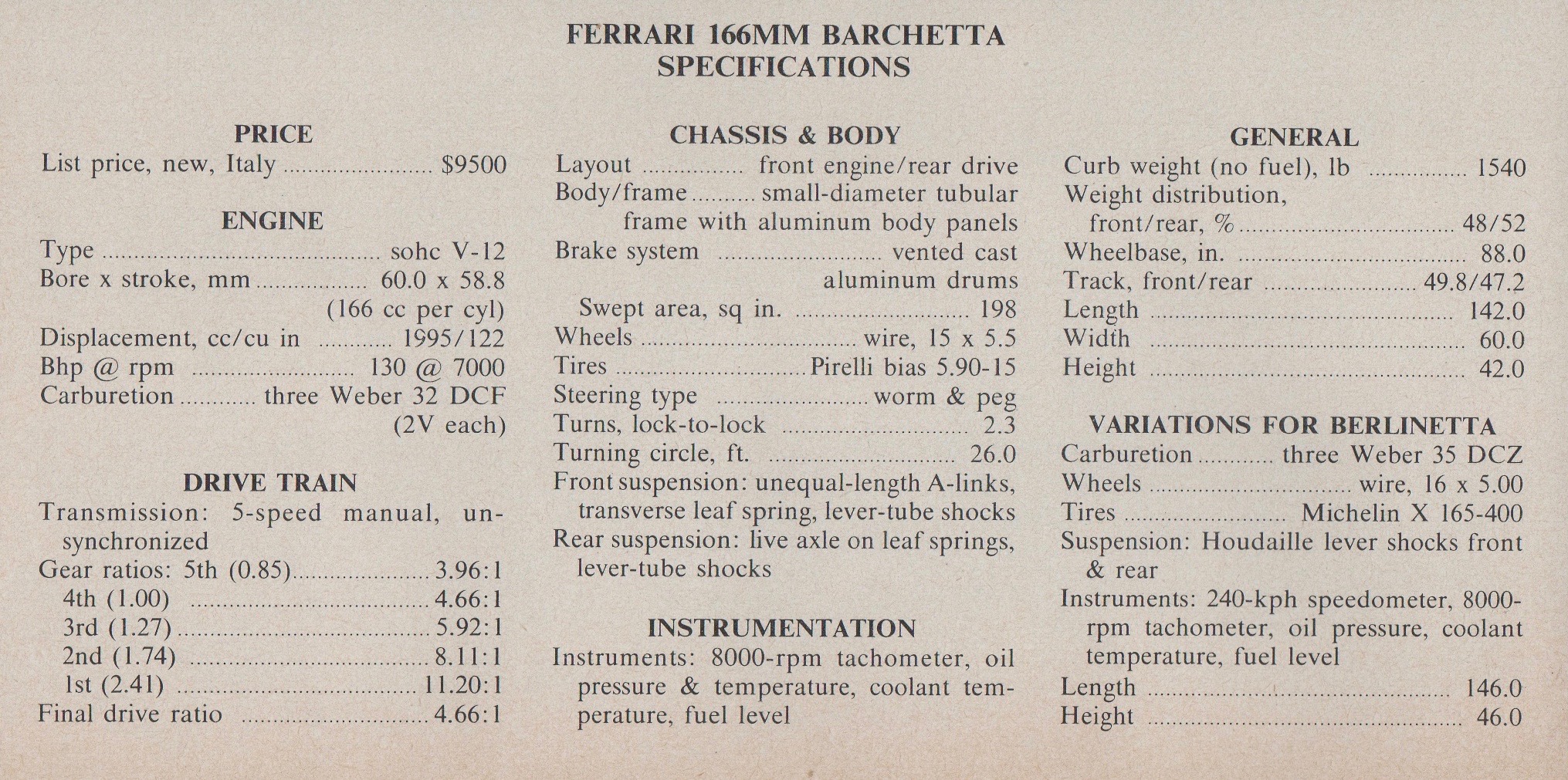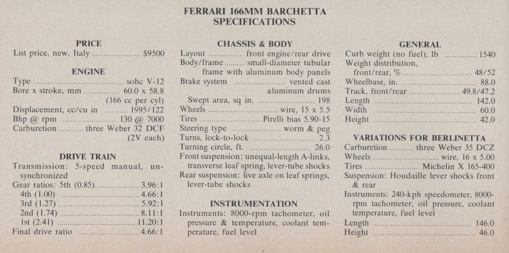 Here’s what else John said about the Berlinetta in the article: It was a Type 166MM 0066 built in 1951. Superleggera body by Touring. Same 88-in. wheelbase, but different wheels (as noted in the specs above). “Engine runs a little more quietly” than the Barchetta’s. Plus, “Leydorf has also put in a lot of extra soundproofing.”