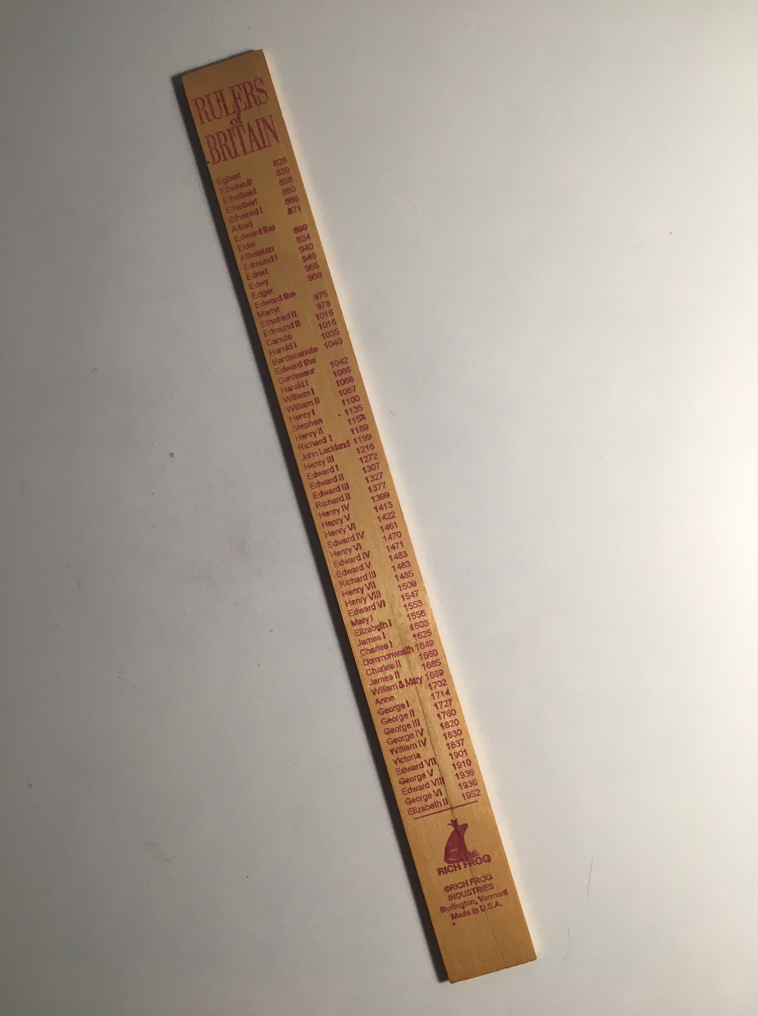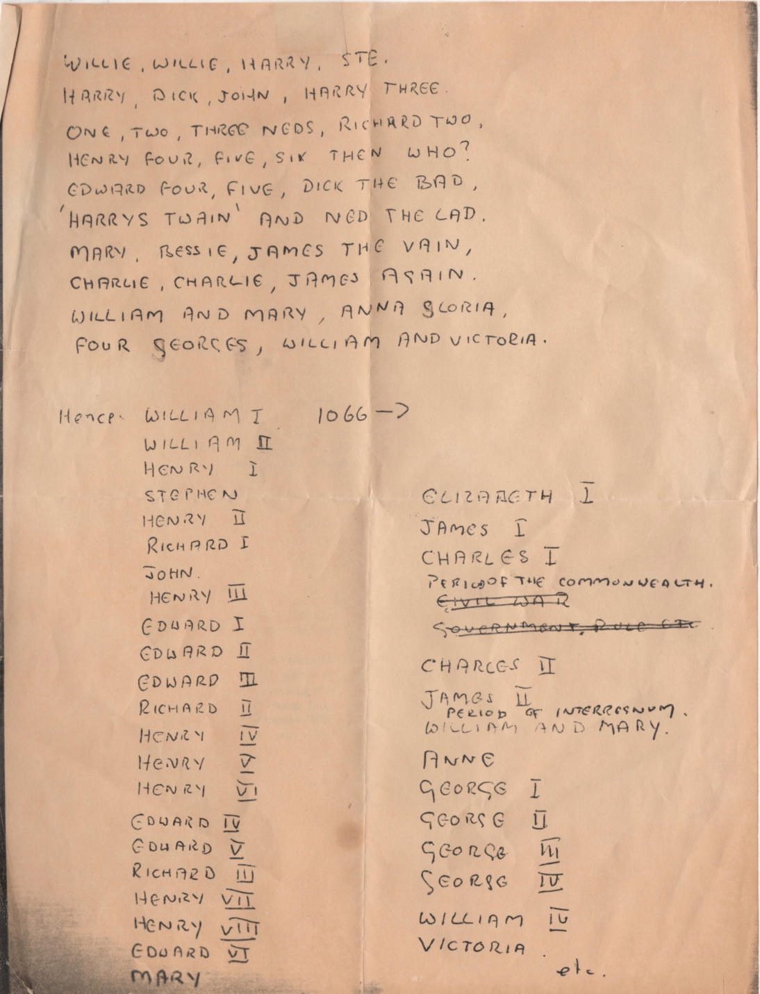 It begins with “Willie, Willie, Harry, Ste,/ Harry, Dick, John, Harry Three,” and ends with “William and Mary, Anna Gloria,/ Four Georges, William, and Victoria.”