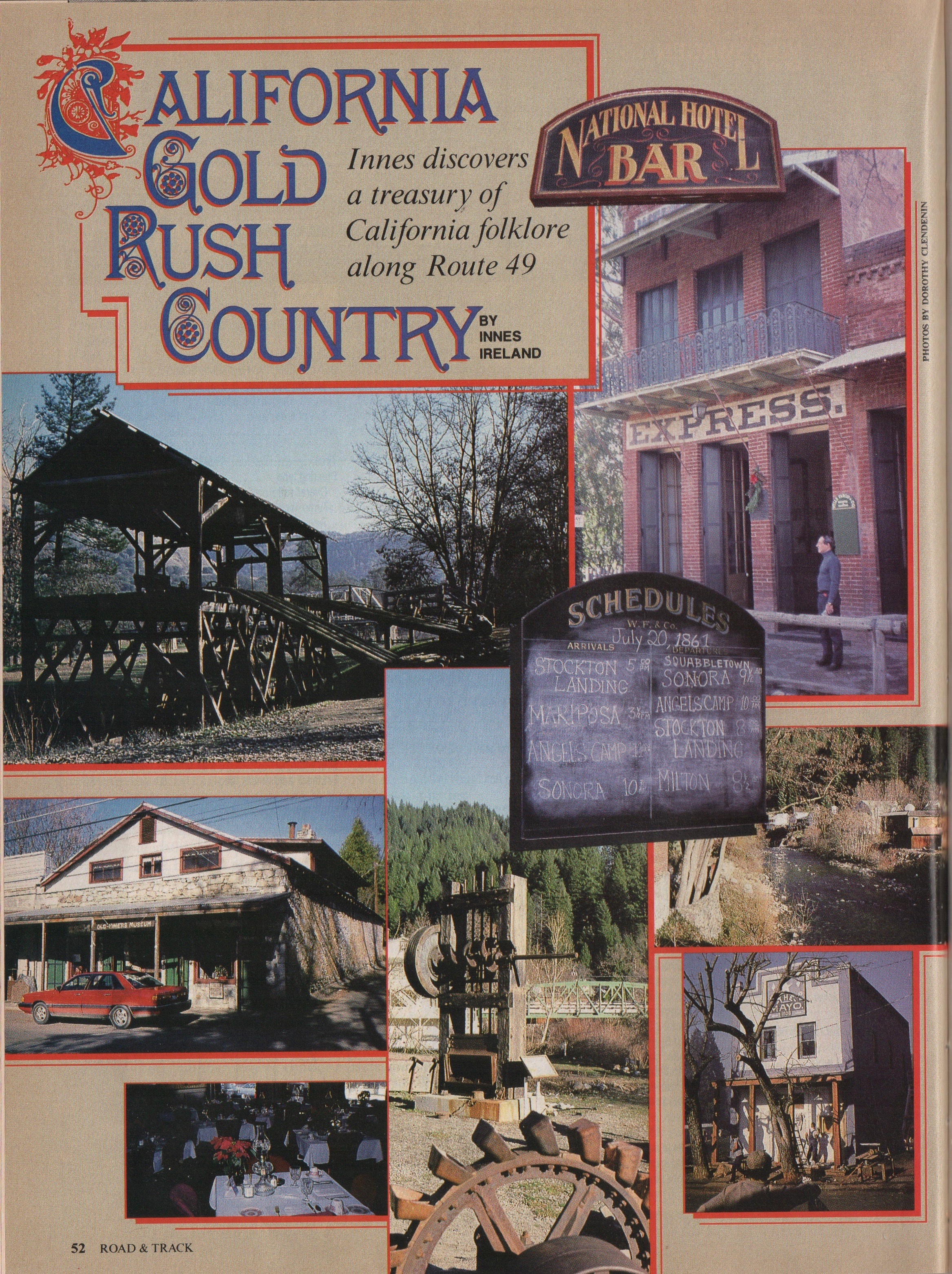 Here in Parts 1 and 2 today and tomorrow are tidbits of Innes’s writing, not from any of his R&T race reports (Innes shared these with Rob Walker), but from “California Gold Rush Country,” R&T, February 1987.