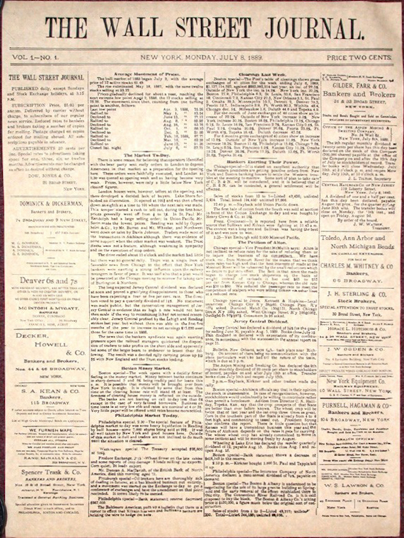 The trio’s Dow Jones & Company went on to found The Wall Street Journal, its first issue published on July 8, 1889. The original WSJ costs 2¢. According to Merriam-Webster, it wasn’t until circa 1939 that “two cents” was “a sum or object of very small value: practically nothing// said angrily that for two cents he’d punch your nose.”