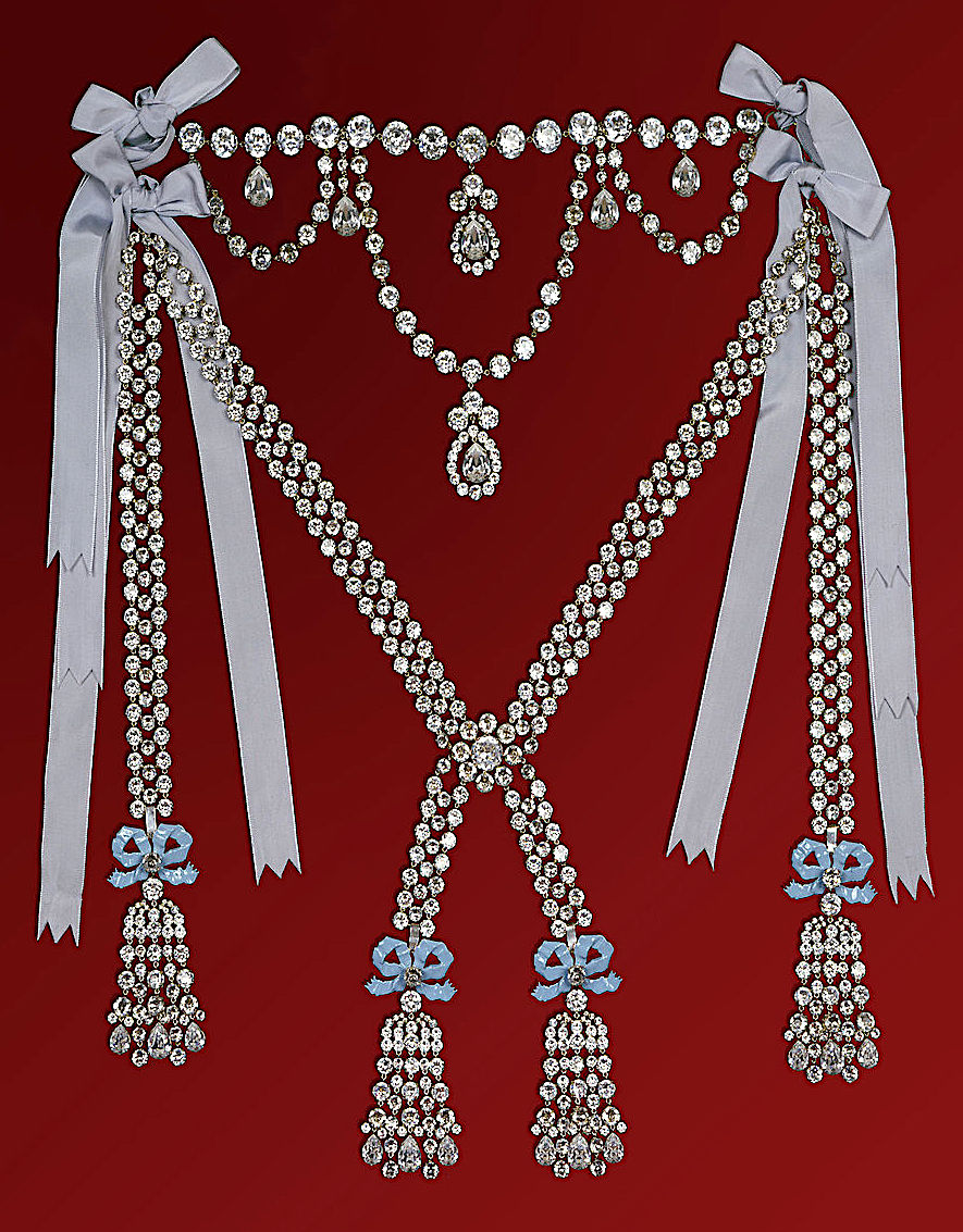 Thomas Carlyle described the jewelry in The Diamond Necklace, 1890, as “a row of seventeen diamonds, as large almost as filberts… a three-wreathed festoon, and pendants enough (simple pear shaped, multiple star-shaped, or clustering amorphous) encircle it… around a very Queen of Diamonds.”