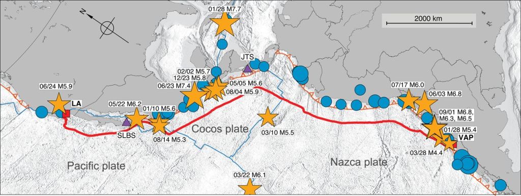 “The Curie cable (red curve),” researchers describe, “is a 10,000-km-long submarine fiber-optic cable connecting Los Angeles (LA) and Valparaiso (VAP) along or across a series of active plate boundaries (blue and orange barbed lines). More than 50 earthquakes with a magnitude of >7.5 (blue dots) have occurred in this region since 1900.”