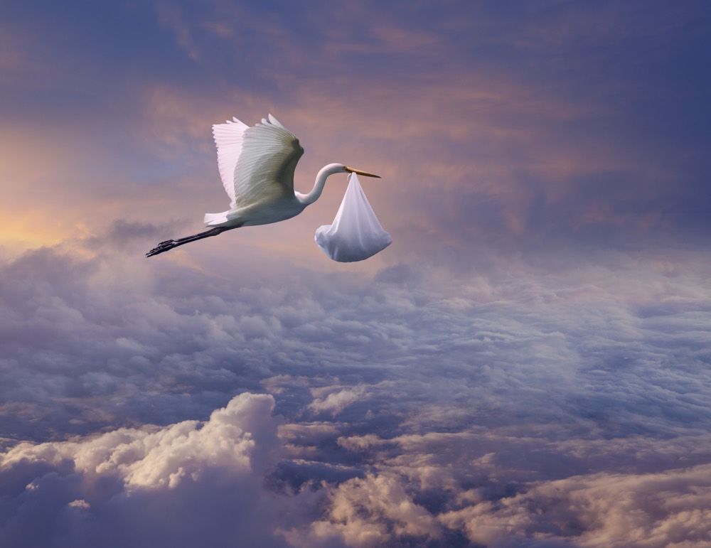 Storks Bring Babies. The image is a strong one: a flying stork with a cloth bundle suspended from its beak. Live Science suggests that medieval wedding ceremonies flourished during the summer solstice. And the stork’s migration return occurred the following spring, nine months later.”
