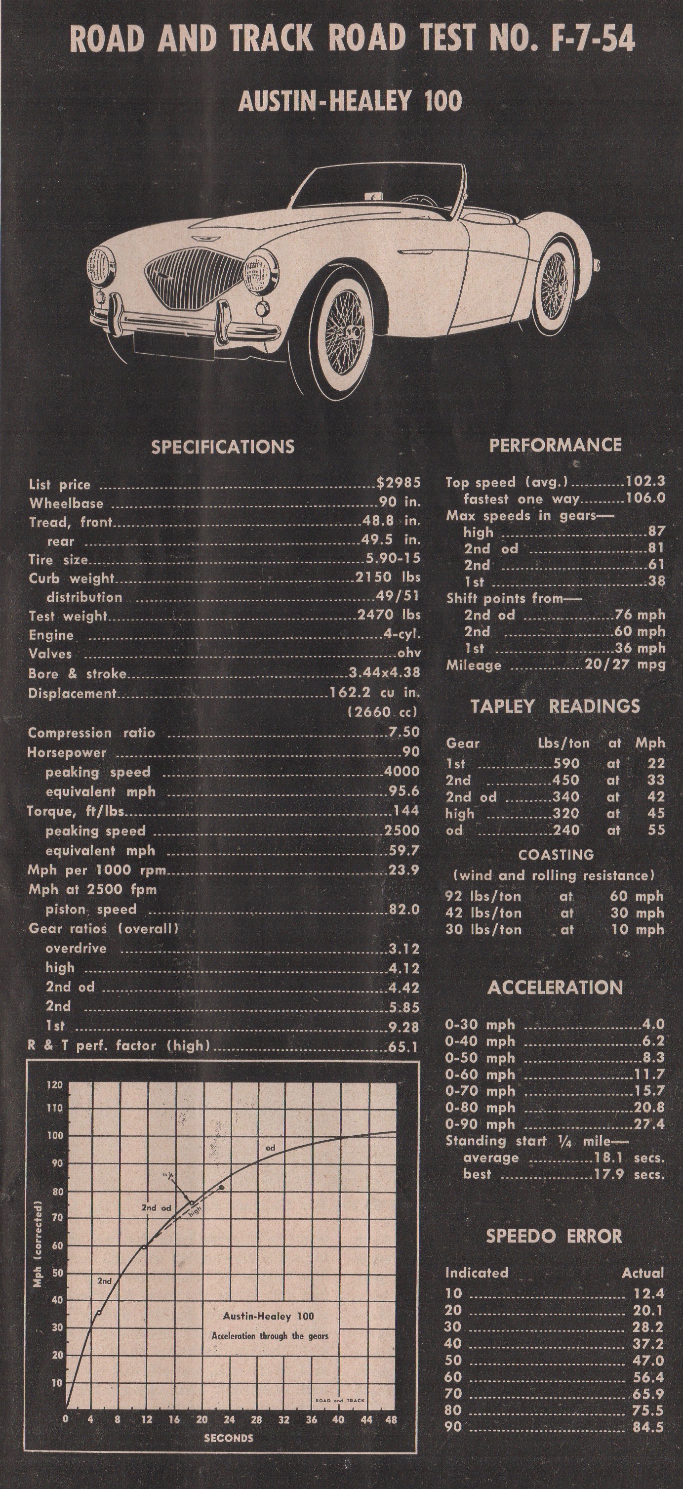Here are tidbits from “Road Testing the Austin-Healey,” R&T, July 1954.