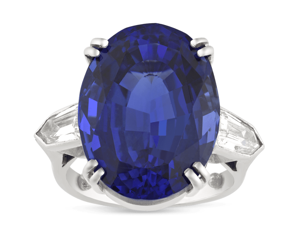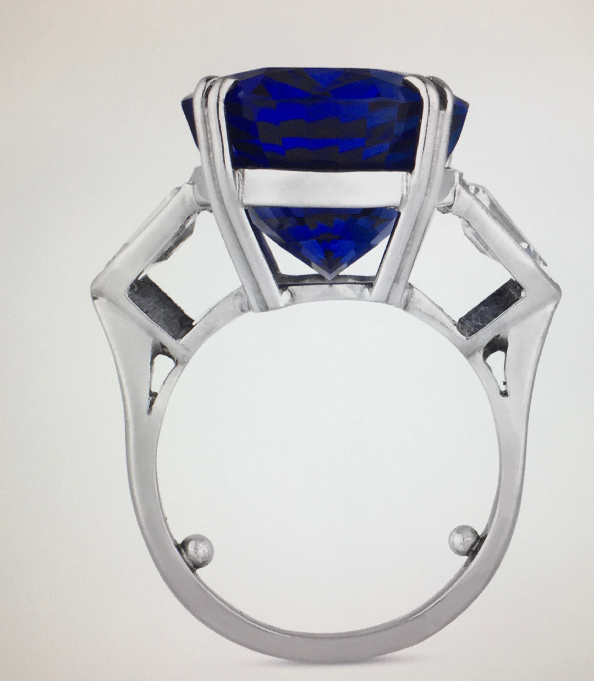 Tanzanite Ring, 22.00 Carats. The M.S. Rau website describes, “Possessing an entrancing deep violet-blue hue, an extraordinary 22.00-carat tanzanite is elegantly displayed in this ring. The oval-shaped jewel is perfectly accented by two nearly colorless shield step-cut white diamonds totaling approximately 1.00 carat, adding sparkle to this stylish creation.”