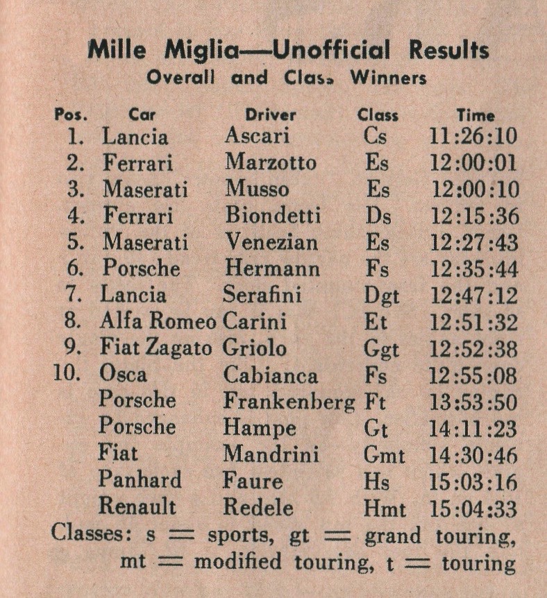 Reinforcing its optimality, Ascari’s Lancia bested 2-liter Ferrari and Maserati competitors by more than 30 minutes. Also, notice the razor finish between Marzotto’s 2nd-place Ferrari and Luigi Musso’s 3rd-place Maserati after more than 12 hours of racing.