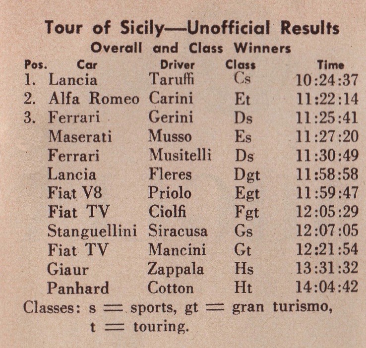 Millanta reported, “During the Tour of Sicily, which includes 11,000 curves, Maglioli never had a chance to shift into 4th gear.”