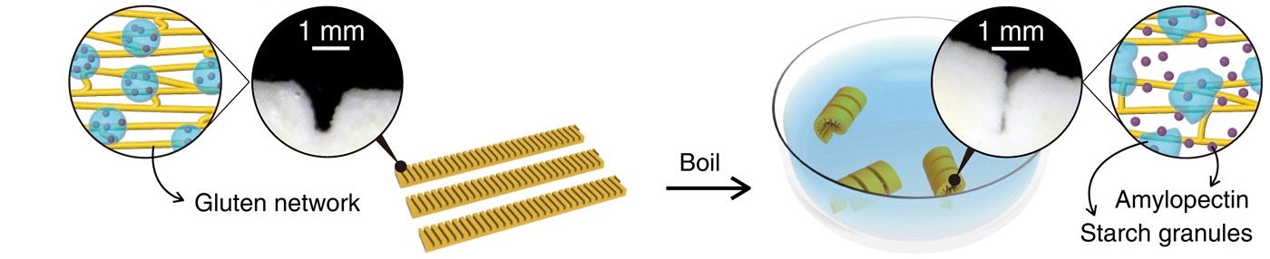 “For the research,” Marion Renault says, “Dr. Zhang developed a computer model that predicted the final transformation of various designs based on factors including how heat and water would change the dough’s gluten and starch during the cooking process. ‘It’s more complex than just swelling,’ he said.”