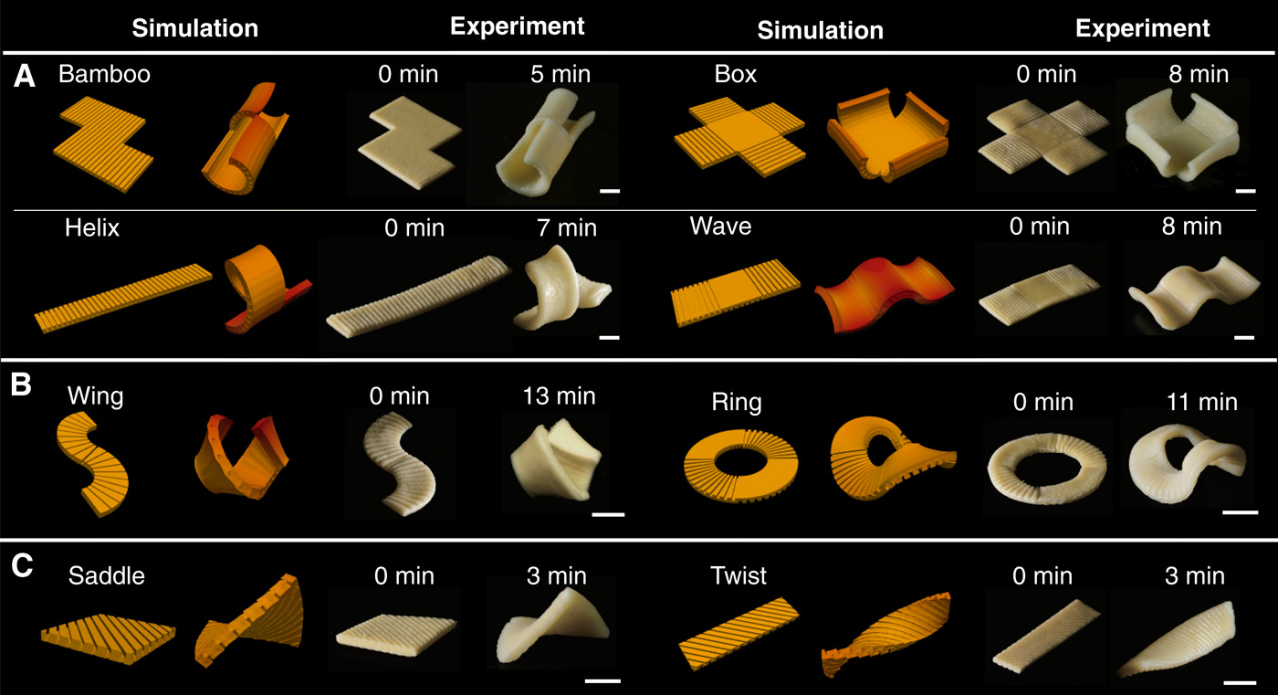 The researchers write, “We also present nonzero Gaussian curvature shapes, such as saddles and twists, by introducing double-sided grooves. These results indicate an even greater scope for groove-based morphing with an enriched shape space and an increased range of potential applications.”