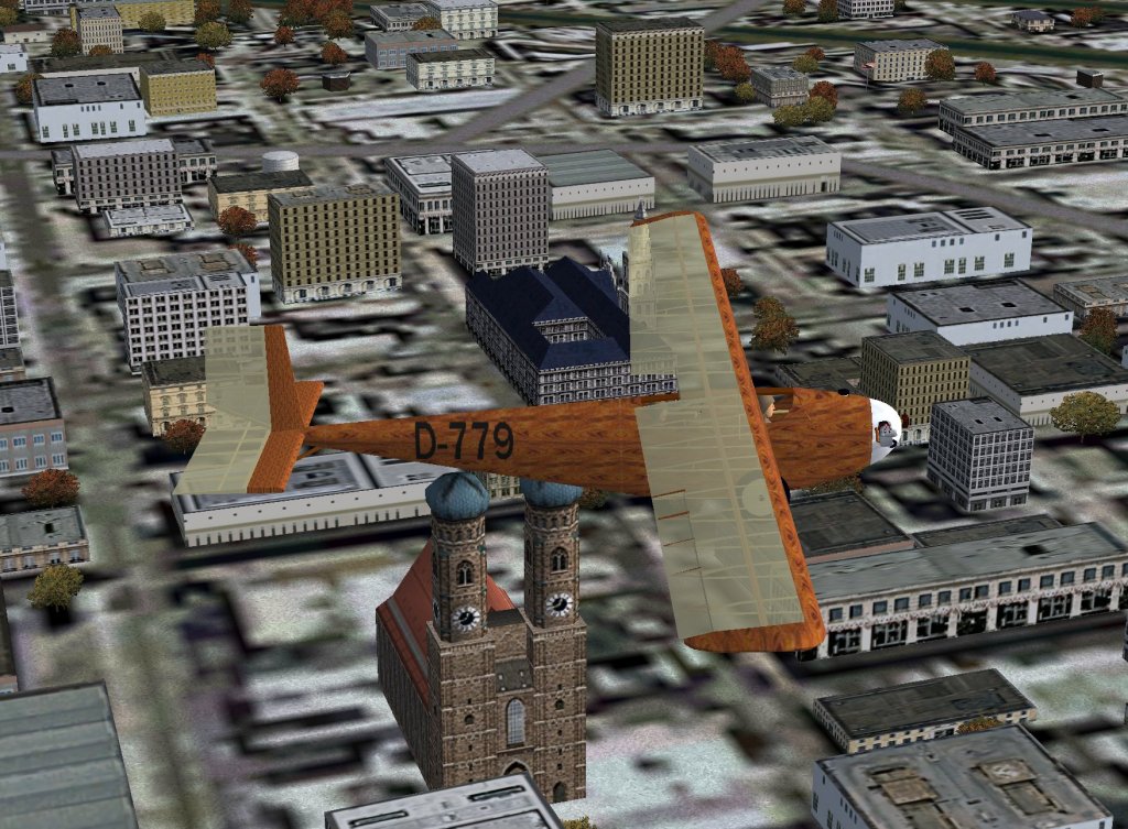 It was fun to peer out of the M-17’s cockpit to either side and see southern Germany zoom by. Approaching Munich, I changed back to 1x for a flyby of Frauenkirche. The M-17’s aerodynamic shape gave no direct view forward.