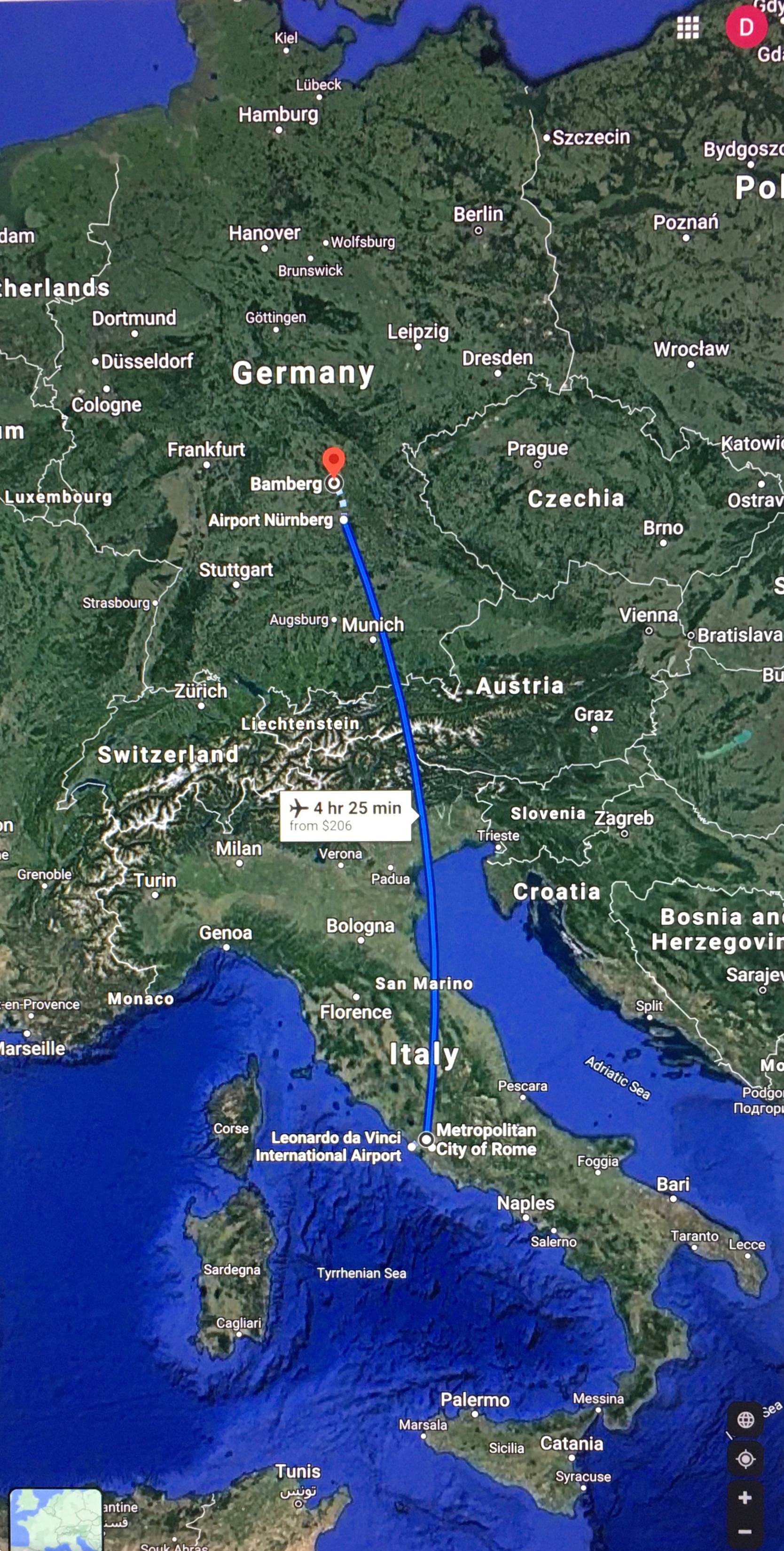 Rome is not quite due south of Bamberg with the imposing Alps in between. So we (the virtual Von Langsdorff, Von Costa, and I) took off from Bamberg, set a course of 175 degrees and a generally ascending trim to prepare for the Alps unseen at that point, but ahead.