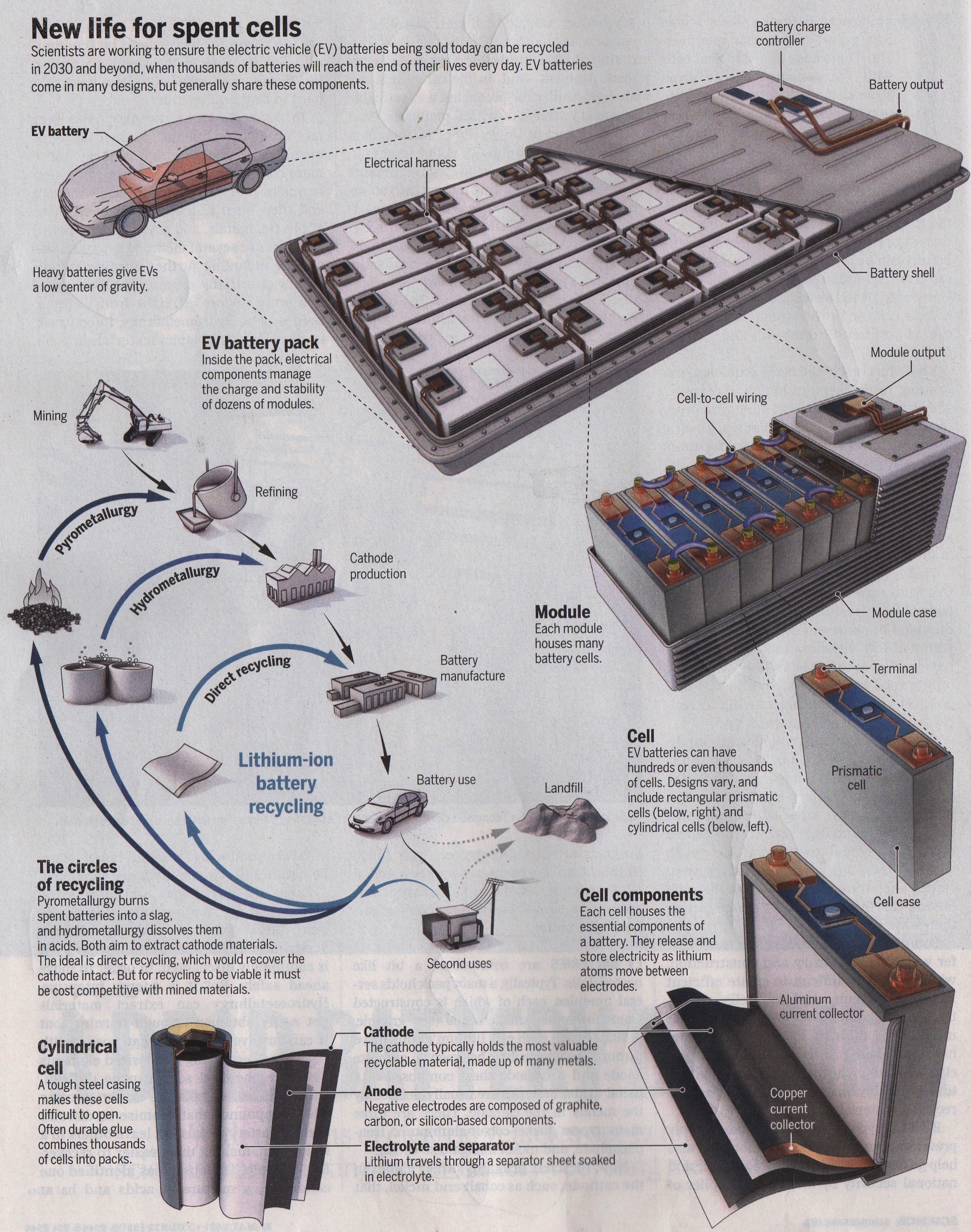 Whether to Recycle. Morse writes, “It’s often cheaper for batterymakers to buy freshly mined metals than to use recycled materials…. Now, recyclers primarily target metals in the cathode, such as cobalt and nickel, that fetch high prices. (Lithium and graphite are too cheap for recycling to be economical.) But because of the small quantities, the metals are like needles in a haystack: hard to find and recover.”