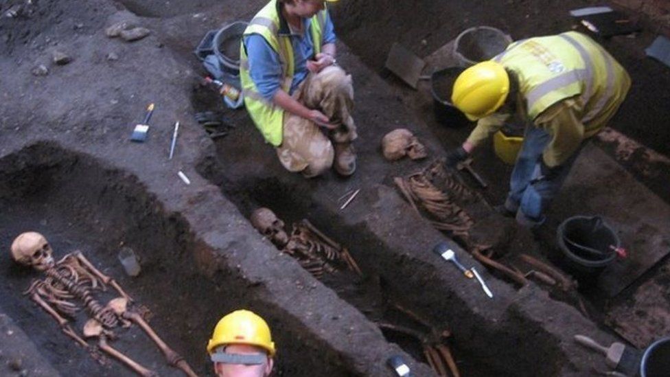 Archaeologists unearth skeletons at St. John’s College, Cambridge, the site of a medieval friary and hospital. Image by Craig Cessford for BBC News, June 11, 2021.