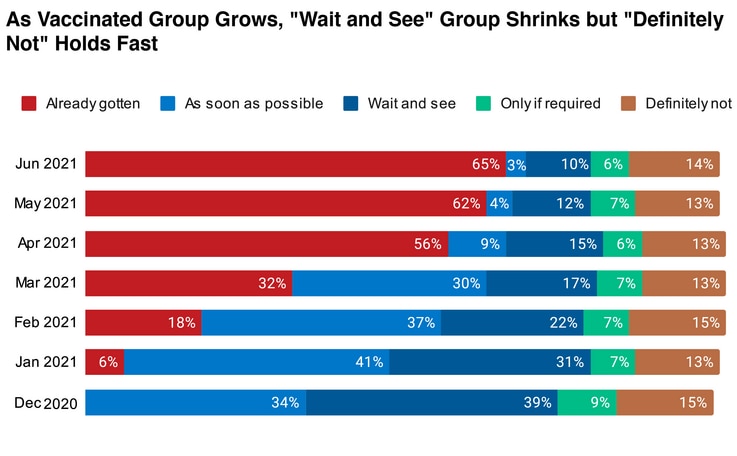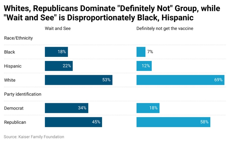 VOA. Writing at the Voice of America website, July 3,  2021, Steve Baragona cites findings from the Kaiser Family Foundation: “Only 14% of Americans say they will definitely not get vaccinated. But this group is 69% white, compared with 7% Black and 12% Hispanic. Republicans make up 58% of this group, while Democrats account for 18%.”