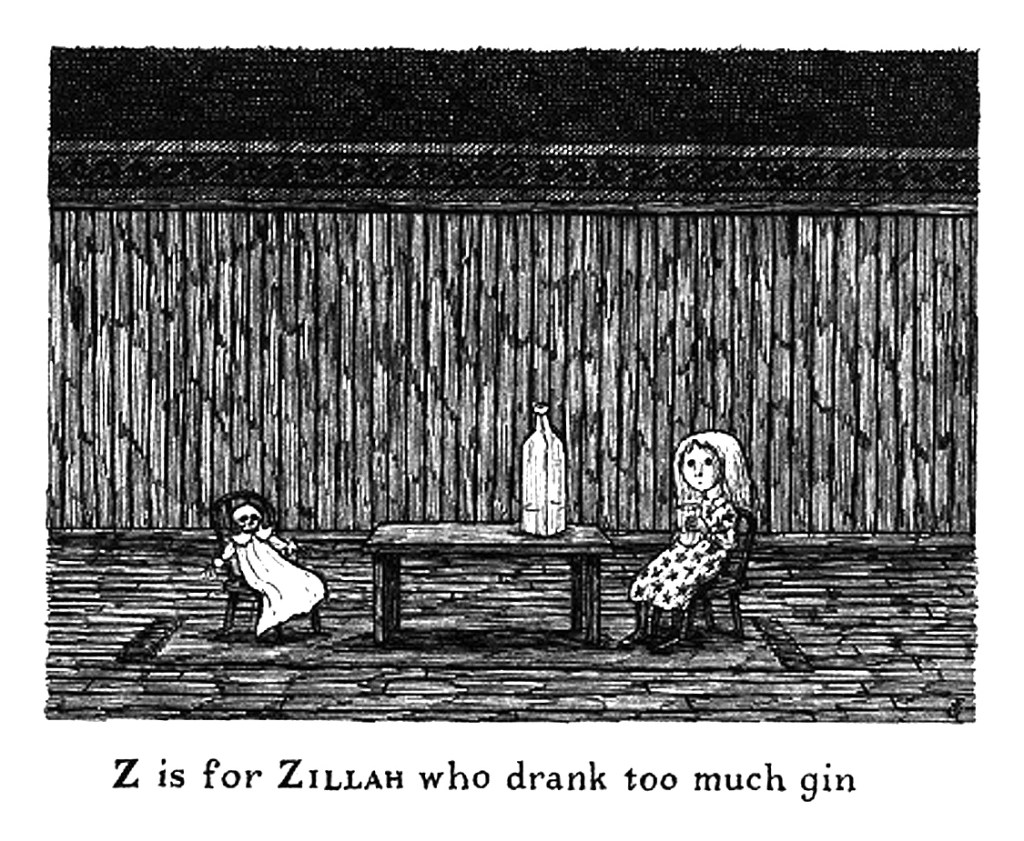 A Victorian Abecedary. In 1966, he published The Gashlycrumb Tinies, or After the Outing, which Hill describes as “an Abecedary in the Victorian style: 26 children meet their deaths in different ways, from ‘A is for Amy who fell down the stairs’ to ‘Z is for Zillah who drank too much gin.’ “
