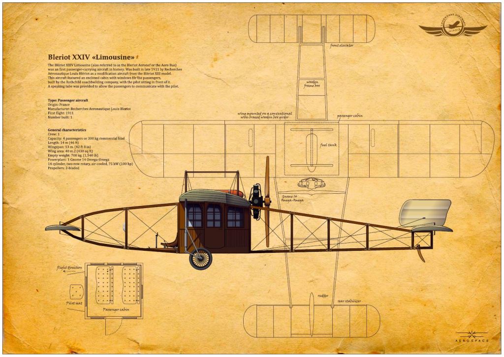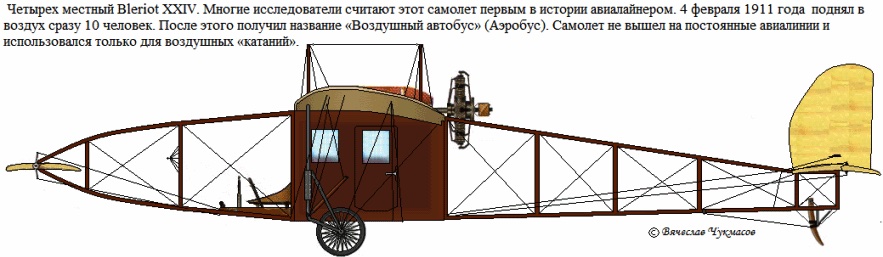 Its caption reads, loosely, “Four-person Blériot XXIV. Many researchers say this plane is the first airliner in history. On February 4, 1911, it sent 10 people aloft. After that, it got named air bus. Though not a regular airliner, it was used for ‘flights.’ ”