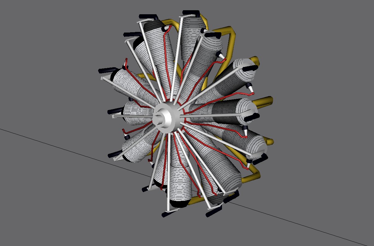 A GMax Limitation. Rotary engines are fun to model, as they rotate with the prop.Their GMax construction is aided by its cloning and rotation operations: Model a single cylinder, its head, its pushrod, its spark plug, its wiring and its intake and exhaust, then clone and rotate for the other cylinders.