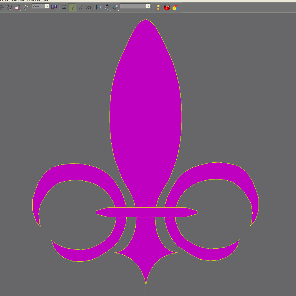 Initially, I tried sketching a fleur-de-lis, but this proved well beyond my artistic ken. But GMax came to my rescue: Its Primitive Shapes include cylinders, the shapes of which can be proportionately deformed, transformed into accessible vertices, with unneeded ones deletable.