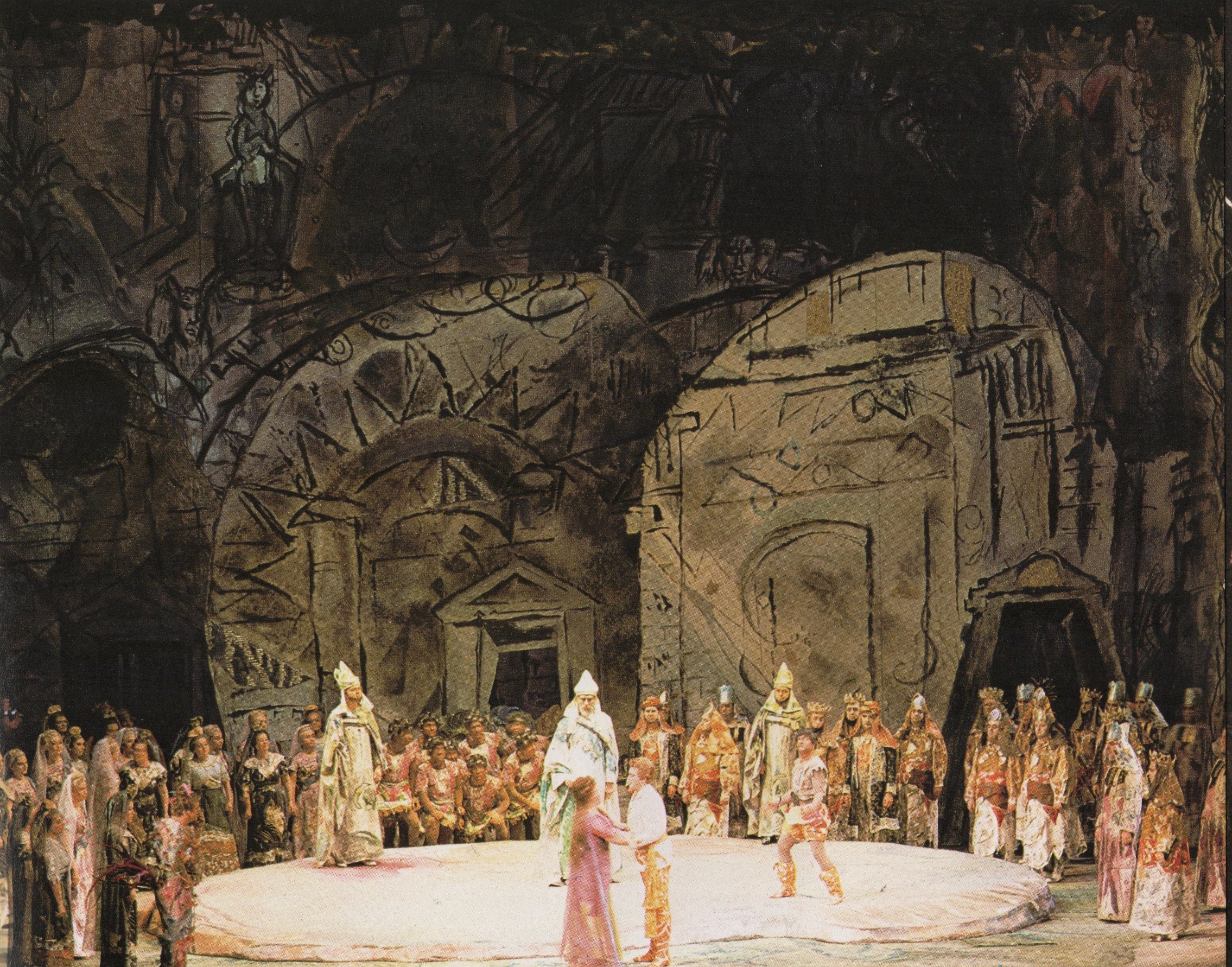 Gunther Rennert, 1911–1978, was a German opera director and administrator. Marc Chagall, 1887–1985, was a Russian-French artist of Belarusian Jewish origin. Together, they took Schikaneder’s instructions and fashioned them into settings for the Metropolitan Opera’s 1967 production of Die Zauberflöte.