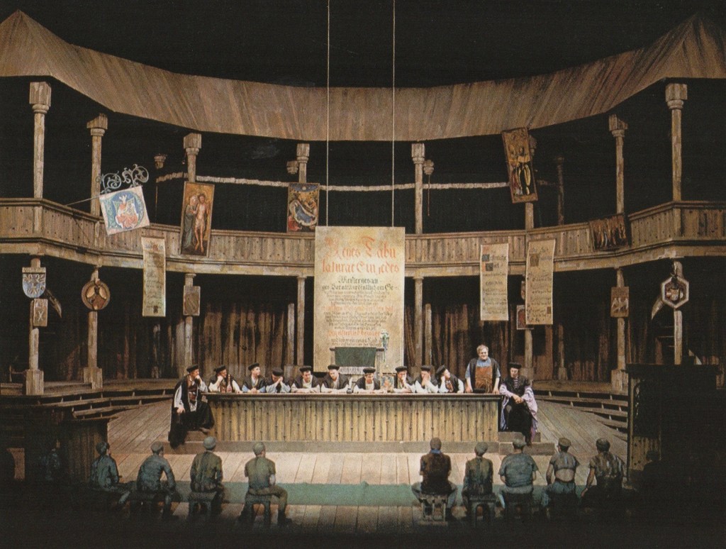Like Schikaneder, Richard Wagner knew what he wanted. Grandson Wieland Wagner, 1917–1966, was producer as well as stage designer for the 1963 Bayreuth production of Meistersinger. Wieland wrote, “I have come to feel that The Mastersingers plays a very special intellectual role in the work of Richard Wagner: It is his confrontation with himself, with his own creativity. He states his theory of art for all time, and he wrote a drama on the birth of the work of art.”