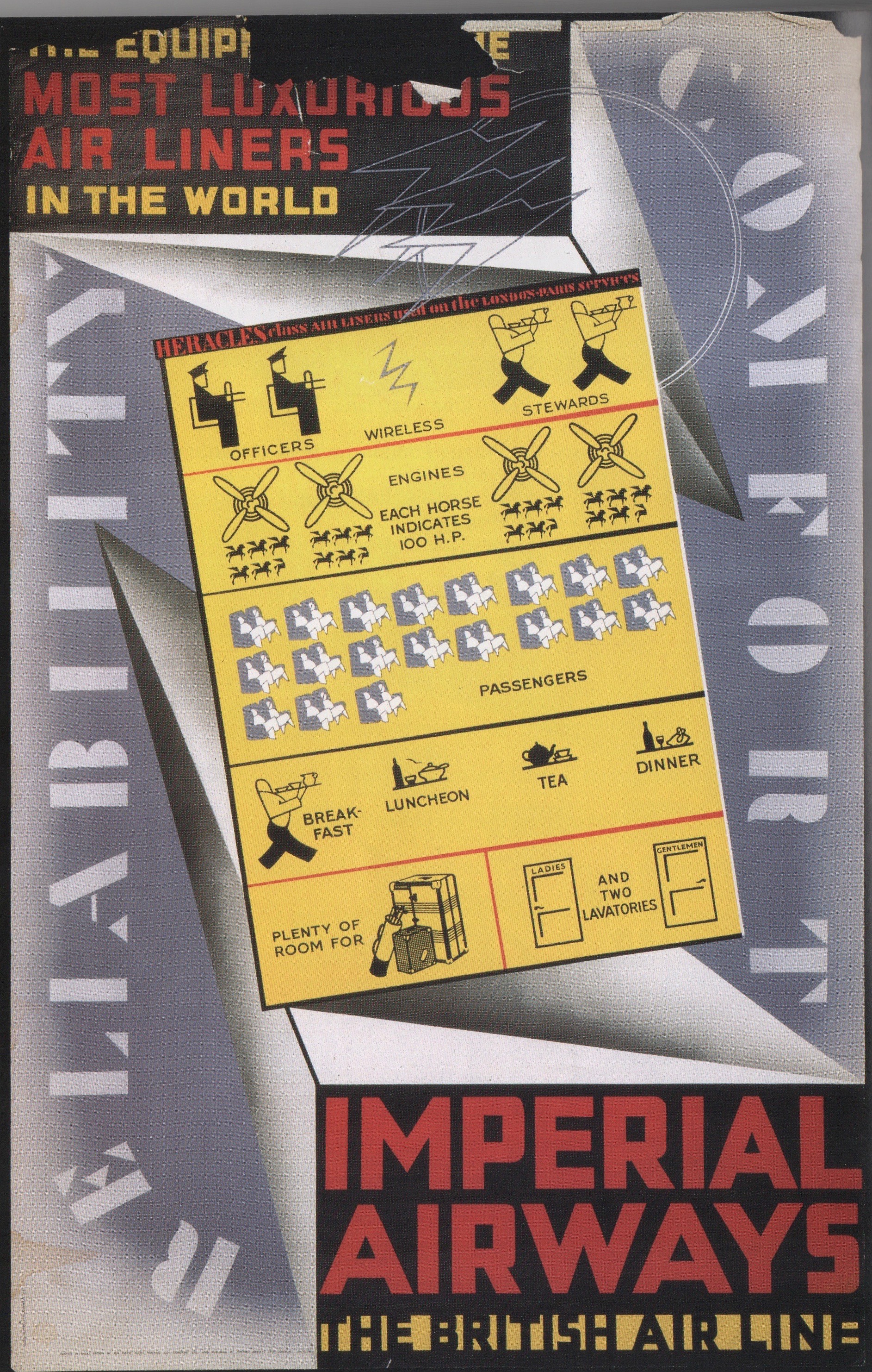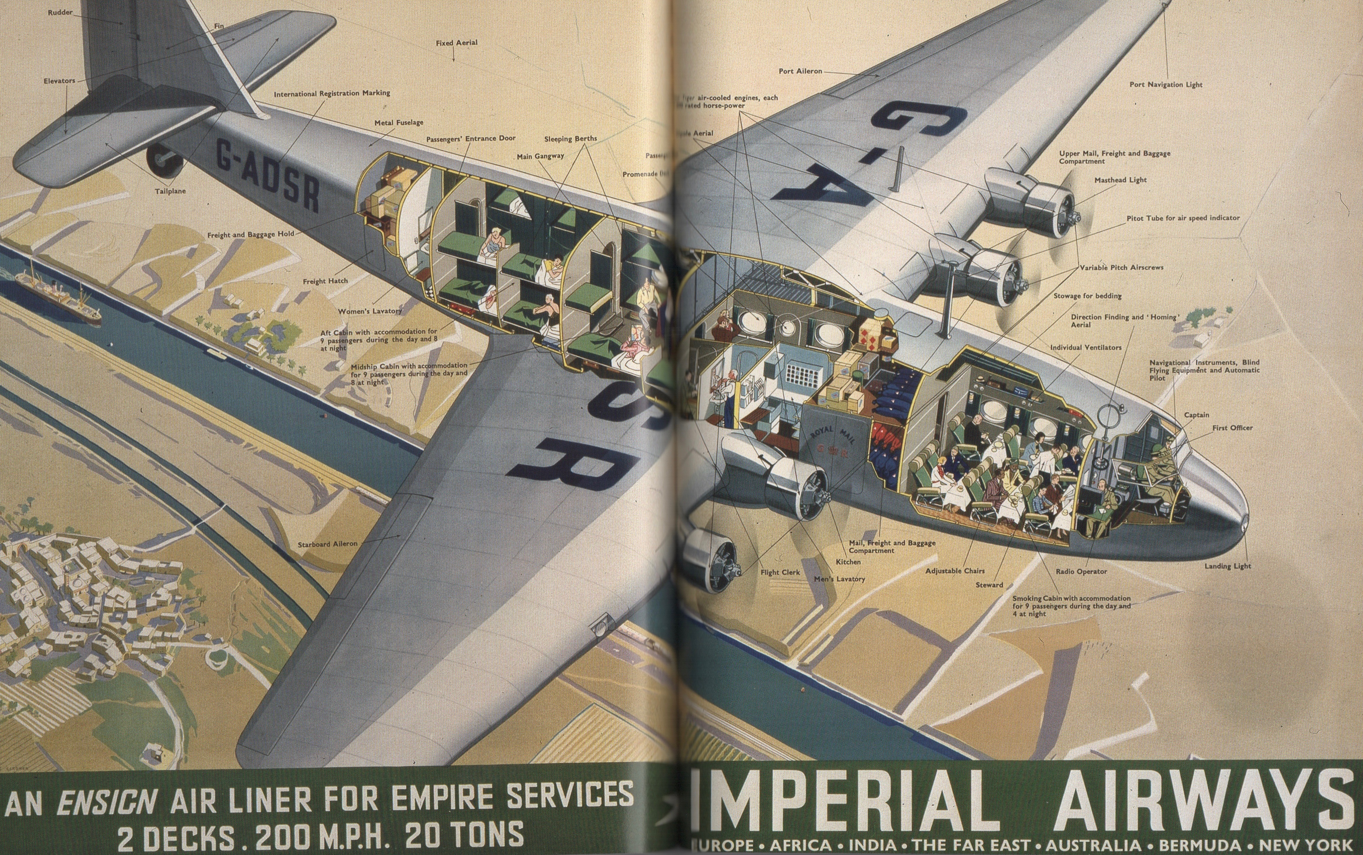 The Armstrong Whitworh A.W.27 Ensign was the largest airliner built in Britain during the Interwar period. This poster shows several of its advanced features, including multilevel accommodations, adjustable seats, and sleeping berths in its 27-passenger long-haul variation.