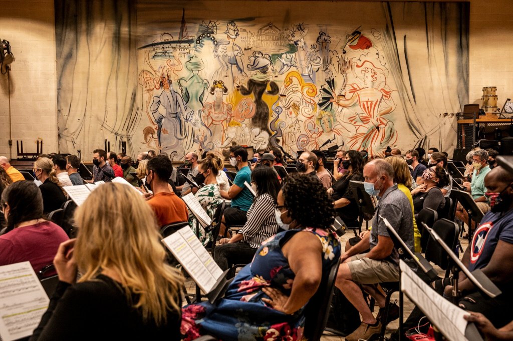 The Met chorus is back at work, singing through masks. Image by Krista Schlueter for The New York Times, September 10, 2021.