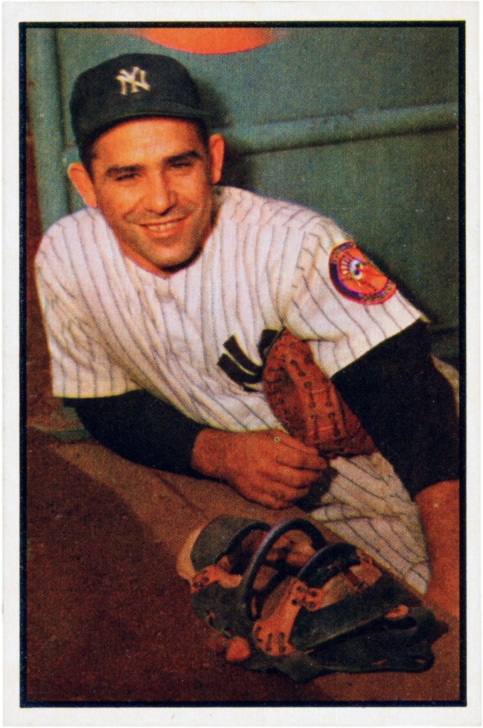 Lawrence Peter “Yogi” Berra, 1925–2015, played 19 seasons in Major League Baseball, all but the last with the New York Yankees. This image, from 1953, by Bowman Gum from Wikipedia.