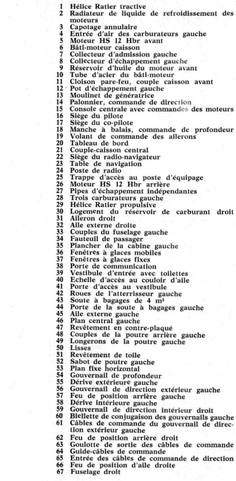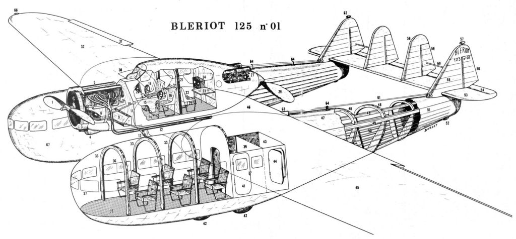 Cutaway, en Français. An excellent source for my GMax modeling was a cutaway of the Blériot 125, complete with a list of 67 details identified by number.